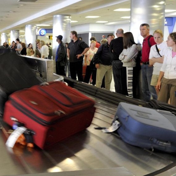 Auf dem Bild sieht man eine lange Reihe von Reisenden, die entnervt und ungeduldig an einem Gepäckband stehen und auf ihre Koffer warten. Die Mienen der Menschen verraten ihren Frust über die zähe Wartezeit und die Ungewissheit, ob ihr Gepäck überhaupt ankommt.
